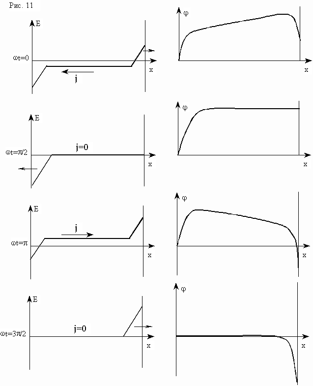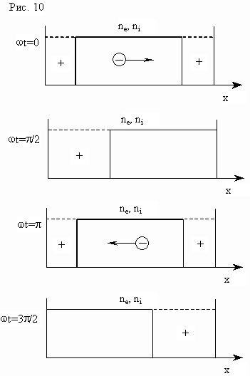 уходят в металл. В состоянии равновесия с обеих сторон остаются слои нескомпенсированного ионного заряда, газ в целом оказывается заряженным положительно. При последующих качаниях электронный газ, если отвлечься от медленного диффузионного процесса, только касается электродов. На рис.10 схематично изображено качание электронного газа в предположении, что ионы совершенно