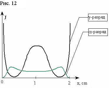 разряд с непроводящими приэлектродными слоями. Распределение интенсивности свечения по длине промежутка показано на рисунке 12. При покрытии электродов диэлектриком всё останется точно так же. При наращивании тока в этой стадии, разряд расширяется в поперечном направлении, заполняя площадь электрода. Плотность тока на электроде при этом остаётся неизменной. Когда электрод полностью заполняется током и диаметр разряда вырастает до диаметра электродов, для дальнейшего увеличения тока требуется большее напряжение, как в аномальном тлеющем разряде, хотя здесь слои по-прежнему тёмные и непроводящие.