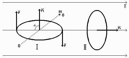 Необходимо, чтобы размер контура был настолько мал, чтобы не искажал исследуемое поле. Контуры, вносимые в магн. поле испытывают ориентирующее действие со стороны этого поля. Рамки принято характеризовать положит. нормалью. Положительной наз. нормаль, проведённую к центру проводника, удовлетворяющего правилу правого винта по напр. тока. На основании действия сил на рамку делают вывод: магнитное поле - силовое и его надо характеризовать опред. направлением. За напр. магн. поля принимают напр. полож. нормали в данном месте распол. контура с током. Определение характеристик маг. поля связано с определением поведения контура с током в поле. В однор. поле внесён контур тока таким образом, чтобы вдоль линий поля была направлена плоскость.