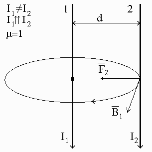Будем считать, что 1 создаёт магн. поле, а 2 находится в поле 1-го. Тогда индукция маг. поля B 1 в точках нахождения 2: B 1 =m 0 I 1 /2pd. F 2 =I 2 B 1 l 2 sina=mI 1 I 2 l 2 /2pd. Можно аналог. рассм. силу F 1 , действующ. на проводник 1 со стороны поля тока I 2 . F 1 =F 2 , если l 1 =l 2 =l. Парал. токи притягиваются, антипарал. - отталкиваются. При рассм. парал. проводников вводят силу, действ. на единицу длины проводника: f ед.дл. =m 0 I 1 I 2 /2pd. (1) Эта ф-ла позвол. ввести единицу силы тока в СИ “1 Ампер”. Опред. ед. силы тока-Ампер Полагая, что I 1 =I 2 =I из (1) имеем: I 2 =f ед.дл. ·2pd/m 0 = f ед.дл. ·d/2·10 -7 . Берём d=1м, f ед.дл. =2·10 -7 Н/м. За единицу силы тока 1A приним. силу такого тока, который протекает по 2-м парал. проводникам, расп. на расст. 1 м в вакууме, вызывает силу взаимодействия между ними, равную 2·10 -7 Н на кажд. ед. длины. Сила Лоренца. Эл. ток предст. собой упорядоченн. движение эл. зарядов. На токи в магн. поле действует сила Ампера, т.е. со стор. магн. поля на кажд. носитель заряда действ. тоже сила. Эту силу наз. силой Лоренца. F л =qVBsina; a=B^V F л =q[V,B] - в вект. форме. На покоящеиеся заряды сила Лоренца не действ. На заряды, влетающие в поле паралл. линиям поля сила Лор. тоже не действ. Если одноврем. действ. электр. и магн. поля, то справедлва ф-ла Лоренца : F=qE+F л Поделитесь этой записью или добавьте в закладки |