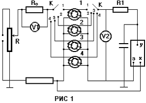 Собрали цепь по схеме, показанной на РИС. 1. Для этого вольтметры V1 и V2 подключили к клеммам A-B и С-D - на верхней крышке макета соответственно. Переключатель К поставили в позицию 1. При этом исследовали трансформатор, кольцевой сердечник которого выполнен из ферита марки НМ 600, сопротивление R0=1 Ом. Таким образом, показания вольтметров численно равны: V1 - эффективному значению тока, текущего в текущей обмотке исследуемого трансформатора; V2 - эффективному значению ЭДС во вторичной обмотке. С помощью движка потенциометра R установили ток равный 0,5 А и плавно уменьшили его до нуля. Сняли показания вольтметров V1 и V2. Данные для расчетов: