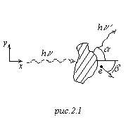 Мы имеем электрон, на электрон налетает фотон, обладающий определённой энергией и импульсом. Происходит столкновение, нельзя фотон уподоблять бильярдному шару, и электрон нельзя уподоблять шару, они как-то взаимодействуют и разлетаются. Мы имели неподвижный электрон и фотон, конечная ситуация: электрон вылетает из этой области взаимодействия и фотон, но поскольку электрон имеет какую-то энергию, то энергия фотона должна быть меньше исходной: