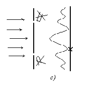 ) это плоская волна, значит, мы устроим пучок частиц с определённым импульсом, частица с определённым импульсом описывается волновой функцией. Эта волна падает на экран со щелями, дальше из этих щелей выходит сферическая волна, и на экране эти волны интерферируют. Если из верхней щели идёт волна