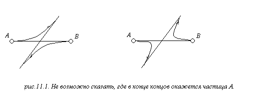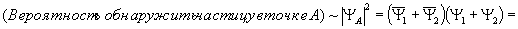 Амплитуда не наблюдаема, фаза наблюдаема, и именно фаза определяет интерференционнный результат. Если частицы проходят через две щели и мы не можем сказать, через какую щель проходят частицы, то в точке A складываются амплитуды, если мы здесь поставим микроскопы, то в точке A складываются вероятности . Это правило вводит в рамки теории тот удивительный факт, что, когда мы ставим микроскопы, то нарушается интерференционная картина. Даже можно понять, почему нарушается. Когда мы пытаемся пронаблюдать частицу в щели, а наблюдение это всегда проявляется во взаимодействии, 1 ) надо по крайней мере идти с фонарём, чтобы её осветить, при чём осветить светом с достаточно малой длиной волны. 2 ) Если мы хотим её фиксировать в пределах щели, то длина волны должна быть не больше, чем ширина щели. Это означает, что частота должна быть достаточно велика, а это означает, что импульс фотона достаточно большой (по крайней мере, один фотон должен рассеяться на частице и попасть нам в глаз через микроскоп) , и когда этот фотон взаимодействует с частицей, то он, конечно, меняет её состояние. А к чему это приводит с точки зрения волновой картины? Когда мы электрон наблюдаем, то взаимодействие приводит к тому, что фаза волны в этой точке хаотически меняется и волны, идущие от этих щелей, перестают быть когерентными, а когда они перестают быть когерентными, то интерференционные члены дают в среднем ноль. Вот как решается эта задача со щелями.