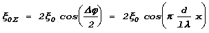 Џолученное выражение ЯвлЯетсЯ длЯ нас вспомогательным. Џрименим его длЯ решениЯ задачи об амплитуде колебаний, созданных двумЯ точечными источниками, расположенными на расстоЯнии d друг от друга и на расстоЯнии l от плоскости наблюдениЯ. ђазность фаз колебаний, созданных нашими источниками в точке x,
